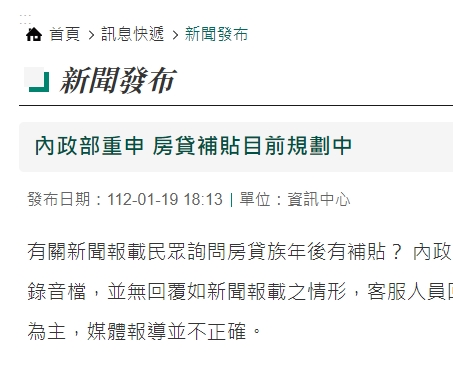 [2023/01/19] 【內政部】重申 房貸補貼目前規劃中